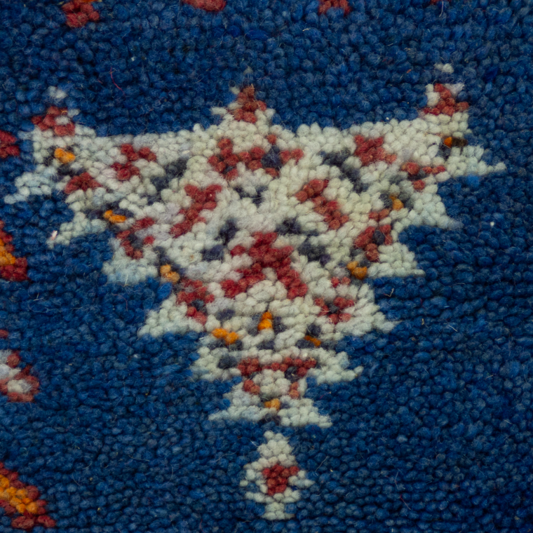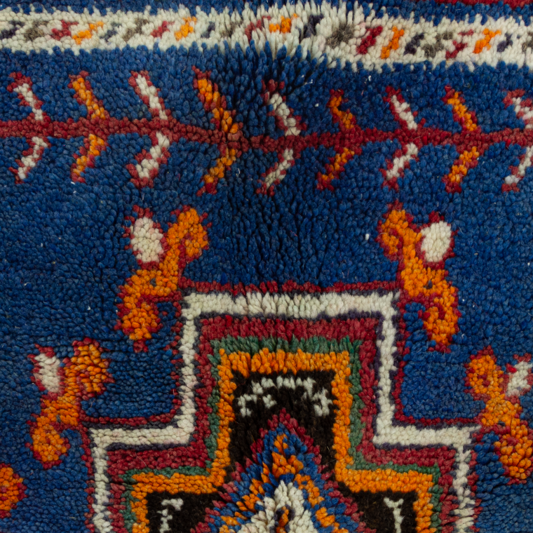 A cheerful contemporary Moroccan rug made of excellent quality wool for a super comfortable feeling underfoot. It was handwoven by the female weavers in Morocco’s Atlas mountains. Exactly in the Taznakht tribe. It stars traditional Amazigh motifs over a blue background. The random and imperfect Amazigh design will add a luxurious look to your space.