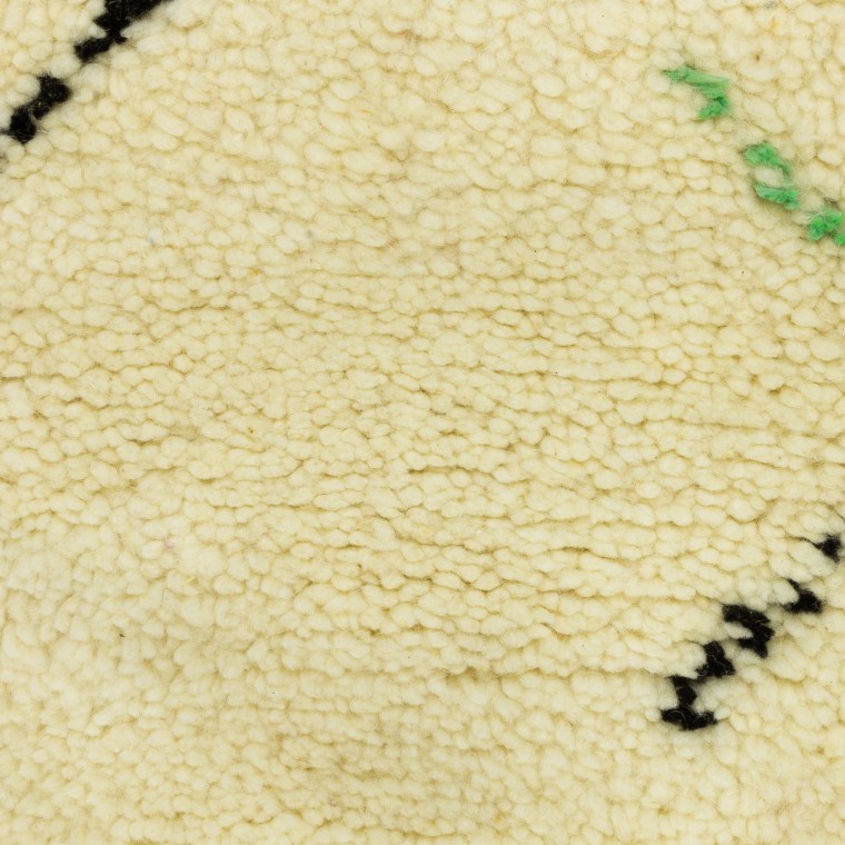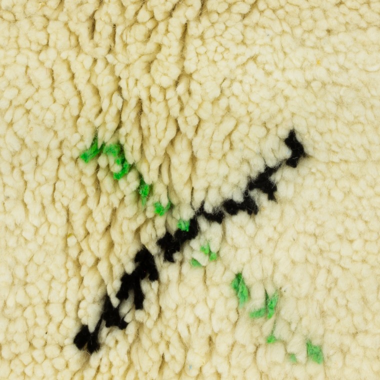 A contemporary Moroccan rug made of high-quality wool for a luxurious underfoot experience. It was handcrafted in Morocco’s Middle Atlas mountains by female weavers. Specifically in the Beni Ouarain tribe. The background of this rug is a lovely white color with black and green motifs. This rug will offer a joyful traditional touch to your space.