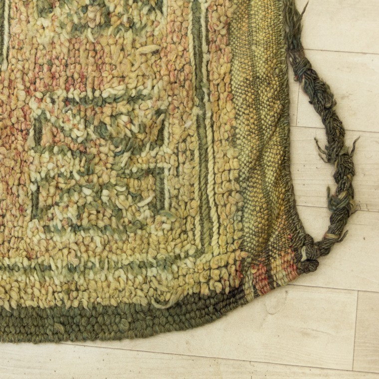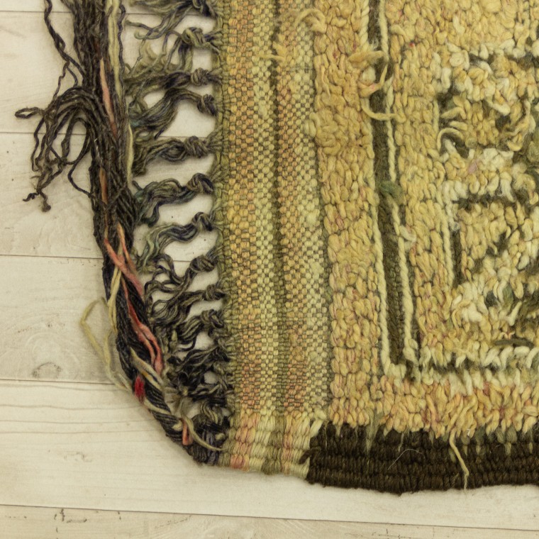 A cheerful vintage Moroccan rug made of excellent quality wool for a super comfortable feeling underfoot. This is an old rug but in very good condition. It was handmade by local women in Morocco’s Atlas mountains. Exactly in the Boujaad tribe. The rug highlights a brown background arranged with different tribal motifs. The random and imperfect Amazigh design will add a luxurious look to your space.