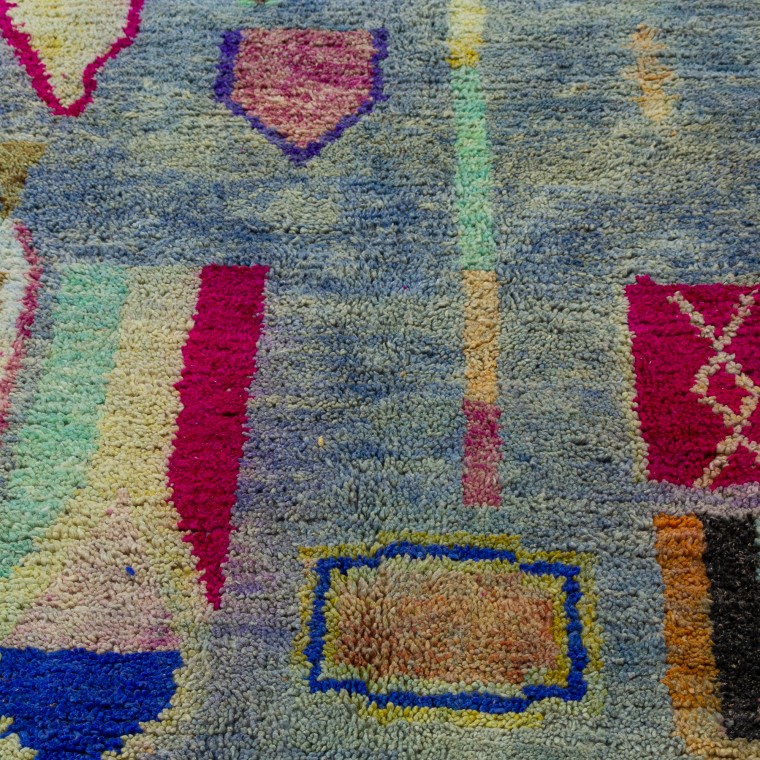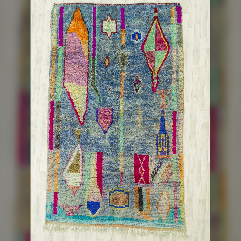 A vintage Moroccan rug made of fine quality wool. This is an old rug that made it through the years, to tell so many stories. It was handwoven by the female weavers in Morocco’s Atlas mountains. Exactly in the Boujaad tribe. It features colorful tribal characters on a blue background. This rug will absolutely add a delighting charm to your living room or bedroom.