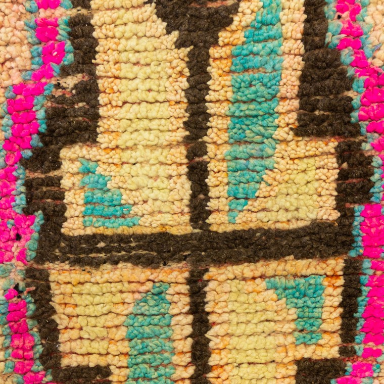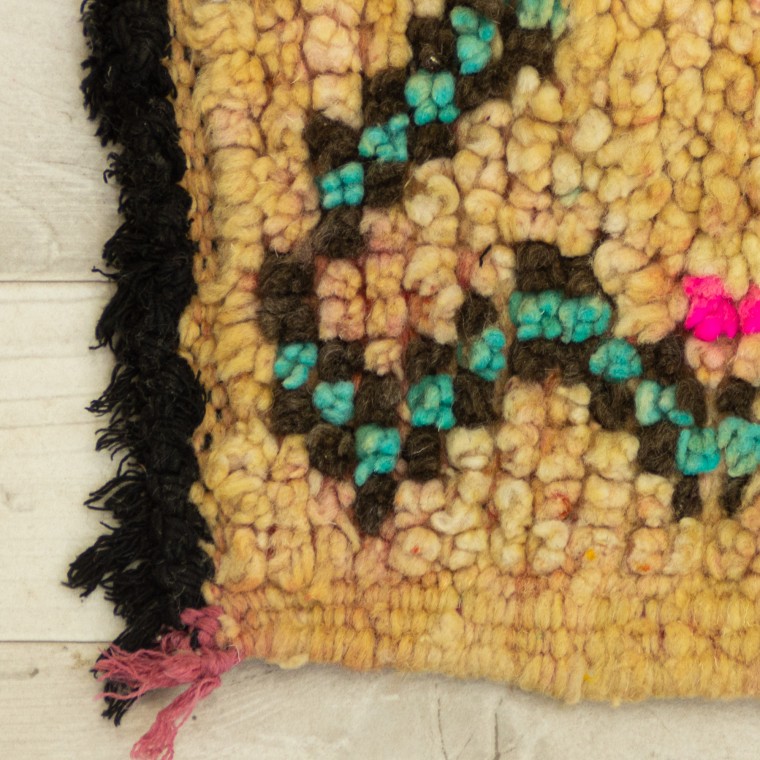 A vintage Moroccan rug made of excellent quality wool for a super comfortable feeling underfoot. This is an old rug that made it through the years, to tell wonderful stories. It was handmade by local women in Morocco’s Atlas mountains. Exactly in the Boujaad tribe. It features multi-colored characters arranged over a brownish background. This rug is a perfect addition to your home or your office.
