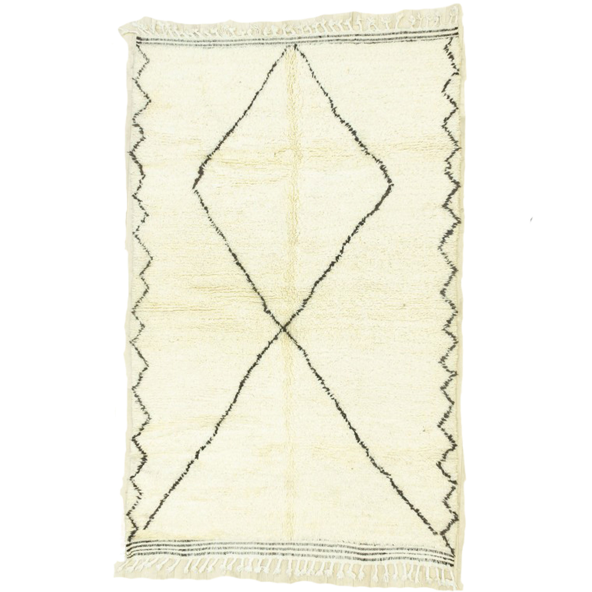 A cheerful contemporary Moroccan rug made of excellent quality wool for a super comfortable feeling underfoot. It was handwoven by local women in Morocco’s Atlas mountains. Exactly in the Beni Ouarain tribe. It features the classic imperfect Beni patterning over a clean white background. This rug will absolutely add a delighting charm to your living room or bedroom.