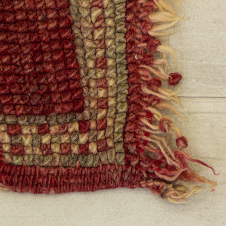 A vintage Moroccan rug made of fine quality wool. This is an old rug that made it through the years, to tell so many stories. It was handwoven by the female weavers in Morocco’s Atlas mountains. Exactly in the Boujaad tribe. It highlights a reddish background interrupted by ivory tribal motifs. It will absolutely add a delightful charm to your living room or bedroom.