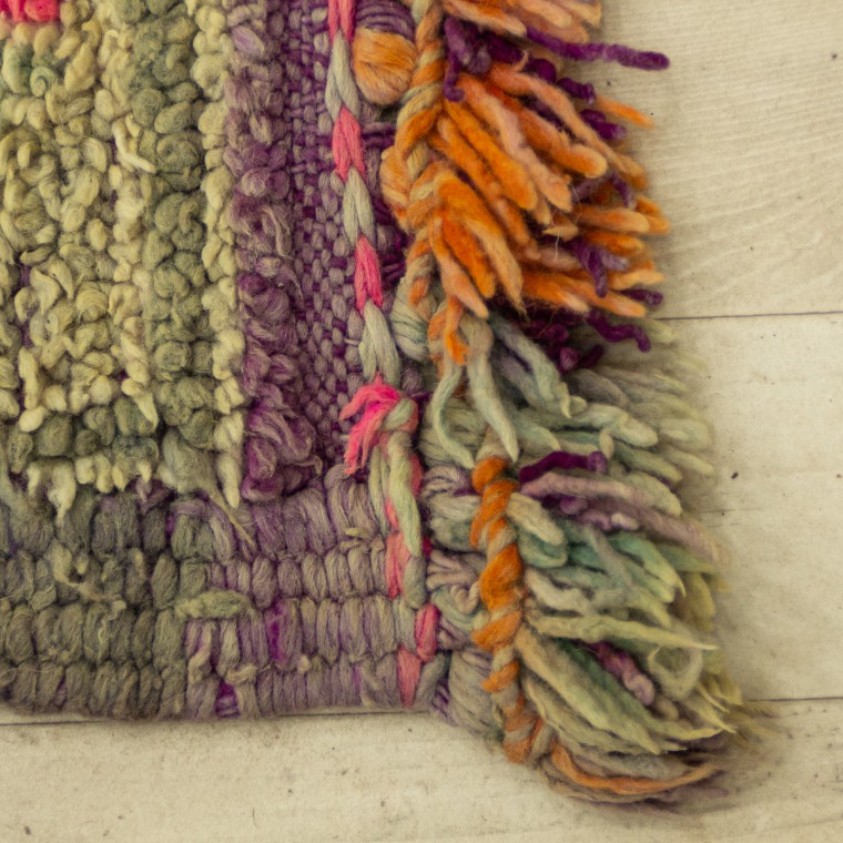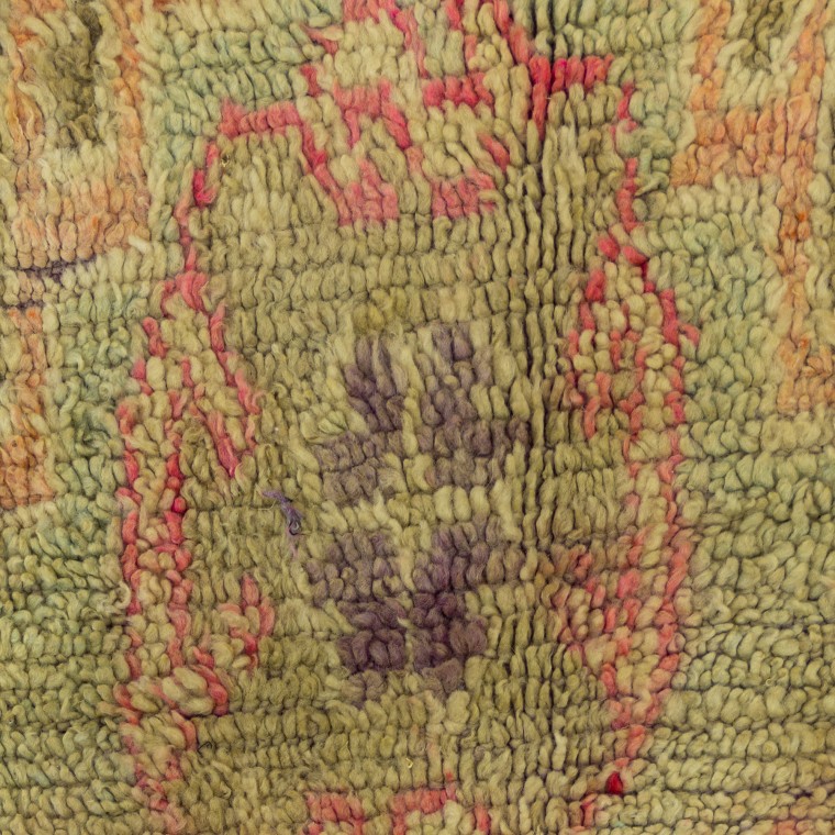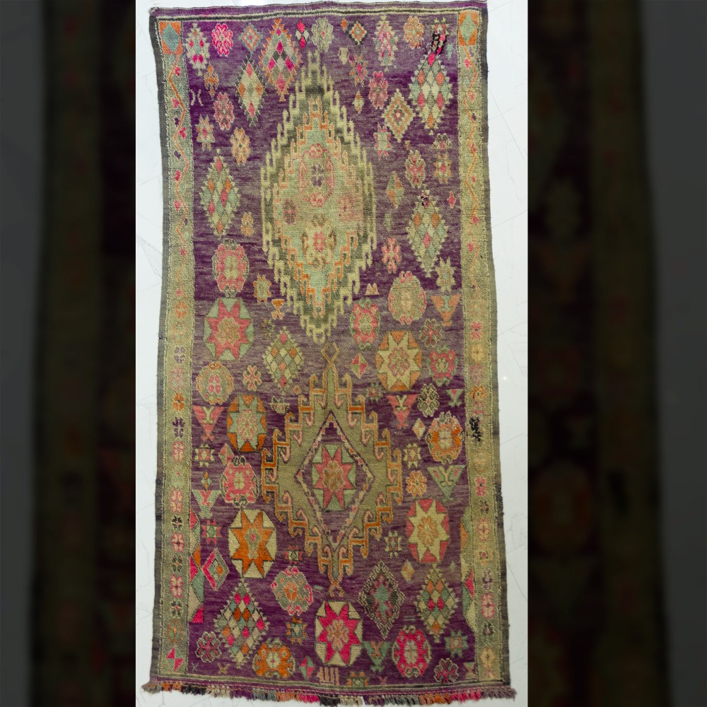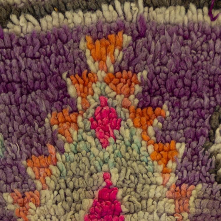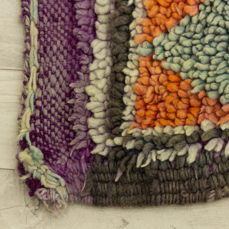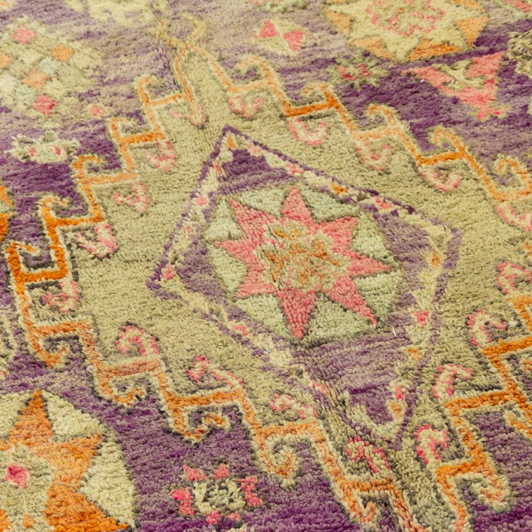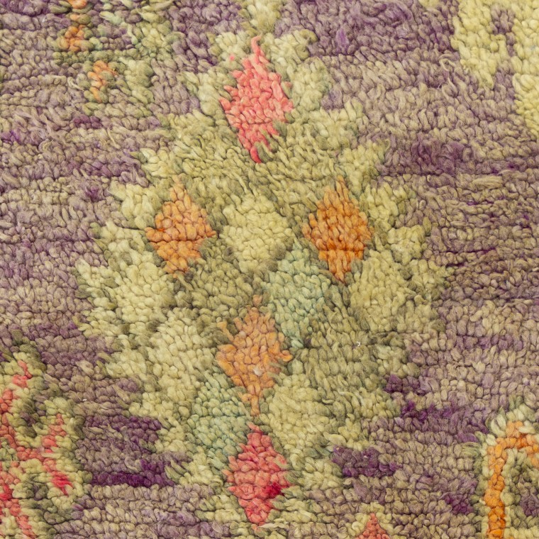 A lively vintage Moroccan rug made of excellent quality wool for a super comfortable feeling underfoot. This is an old rug that made it through the years, to tell wonderful stories. It was handmade by local women in Morocco’s Atlas mountains. Exactly in the Boujaad tribe. It stars rich colorful characters arranged over a purple background. This rug is a perfect addition to your home or your office.