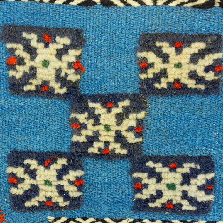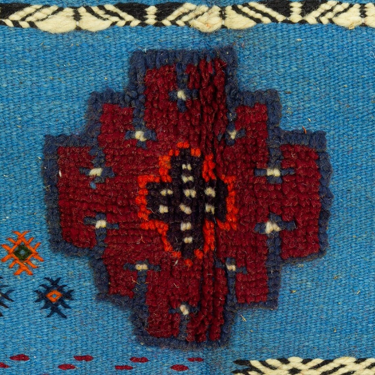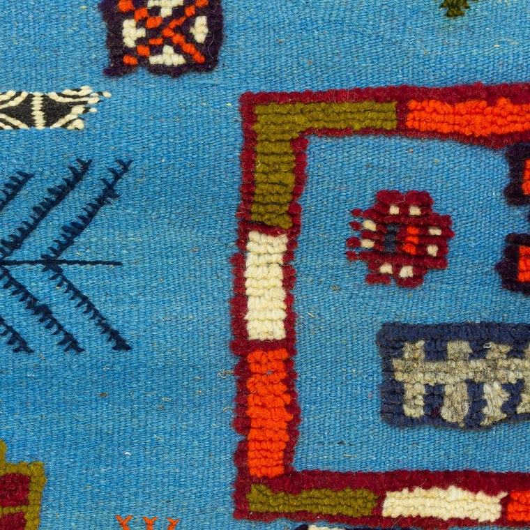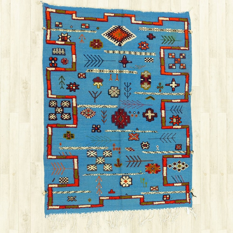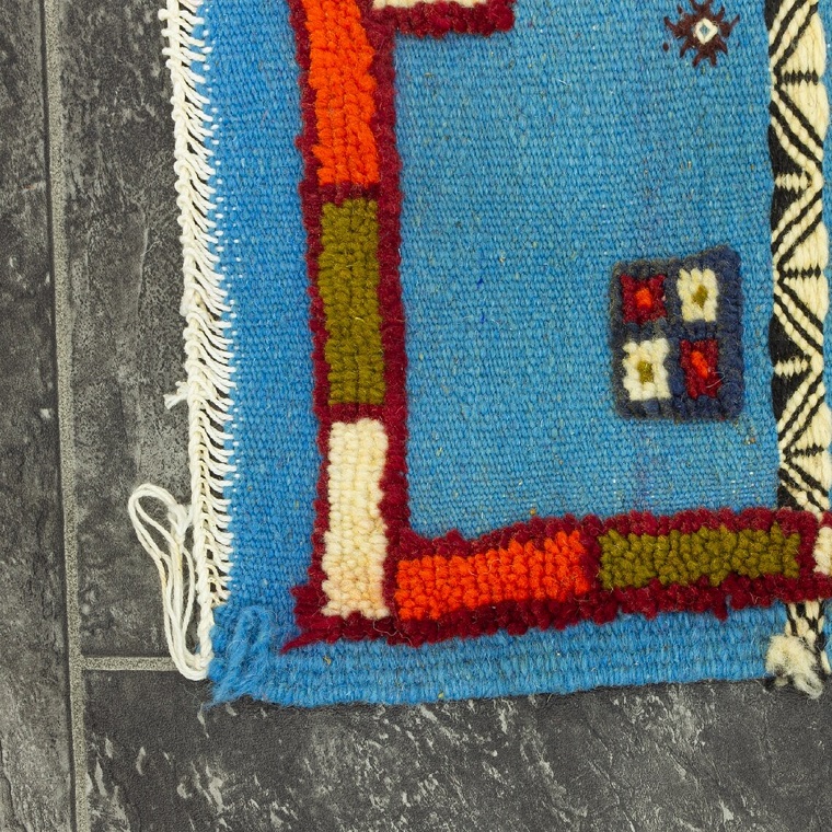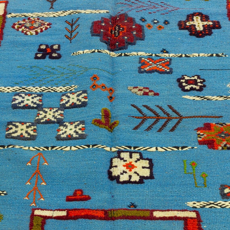 A Vintage Moroccan Kilim (flatweave) made of thread. This rug is pretty old one but in a perfect condition. It was made by local women in Morocco’s High atlas mountains. Exactly in Ait-ougharda tribe. This rug is made of a blue background and multiple little shapes in different colors. Give your space a colorful traditional touch by adding this rug to it.